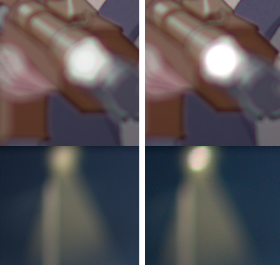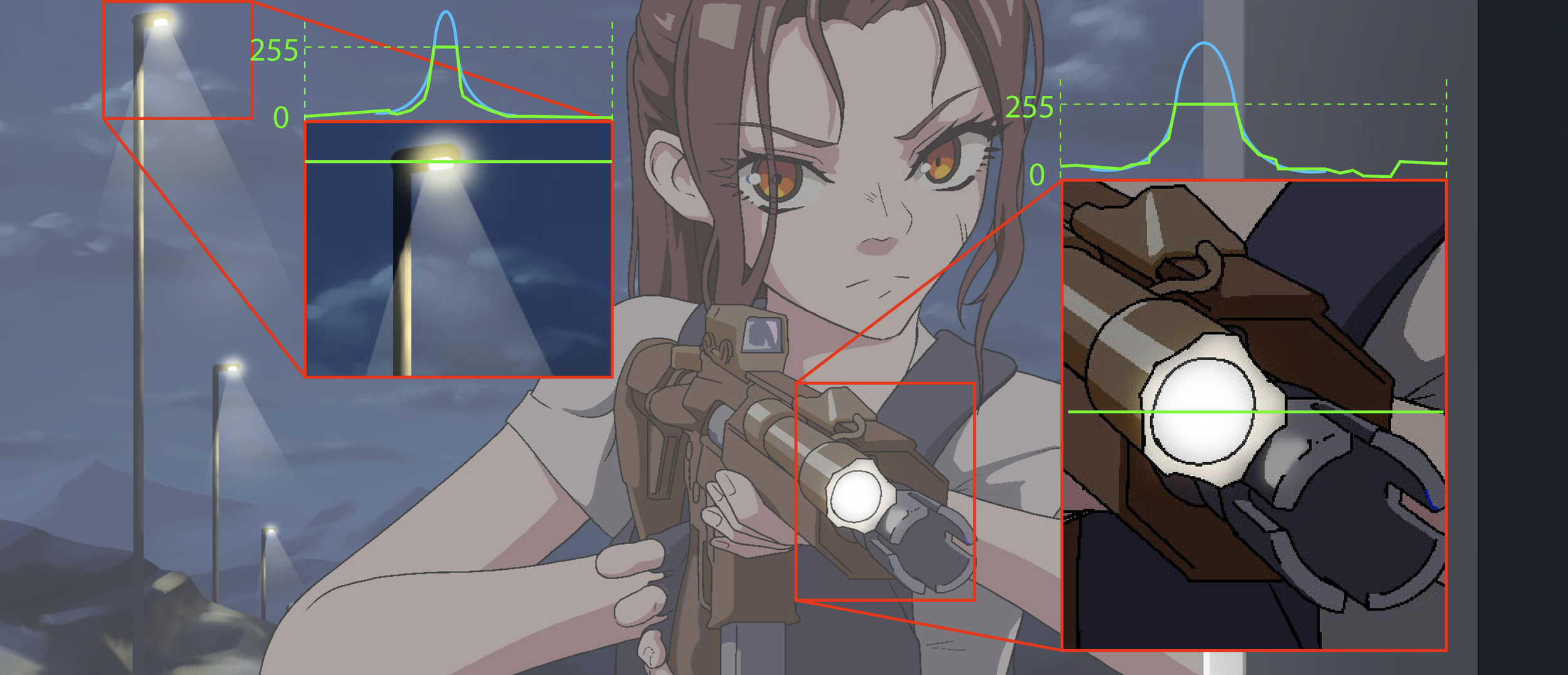 For 2D (hand drawn especially) animation, they are almost done exclusively in 8-bit. This would then create a highlight clipping problem, as their true value are capped at the 8-bit maximum, as shown in the image to the left.