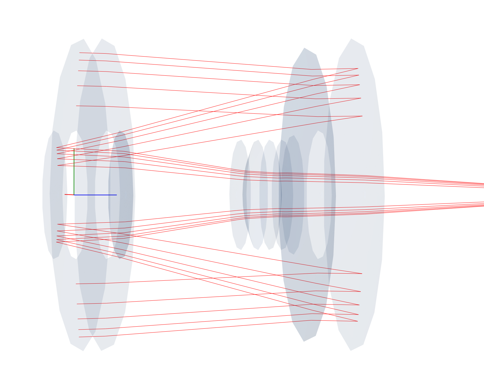 The image on the right shows the on-axis collimated rays propagating through a Tamron AdaptAll 55B 500mm f/8 lens. As always, the lens data can be directly loaded from Zemax files instead of being manually entered.