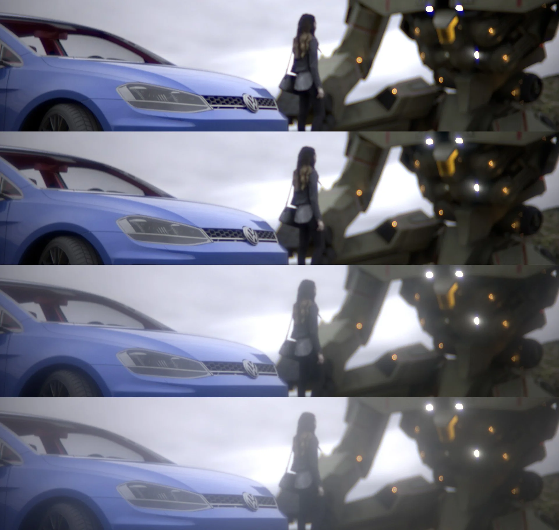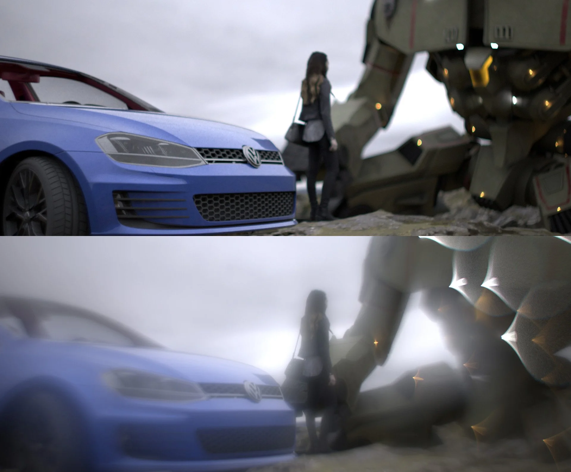 When used in the second imaging pipeline, the framework also allows world unit change at no cost. Whereas the same operation would have broken the software for a large 3D scene with billions of poly, dozens of characters with rigging, and countless special effects. The image below shows the same scene but scaled down 10 times, as a result, the focus distance became significantly shorter and the depth of field ended up as thin as a sheet of paper.